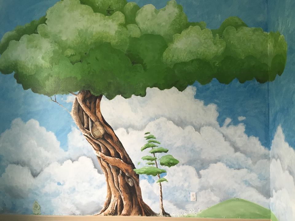 This client requested a Ghibli-themed room for their daughter. I painted elements from My Neighbor Totoro, Spirited Away, Ponyo, Princess Mononoke, and The Cat Returns.