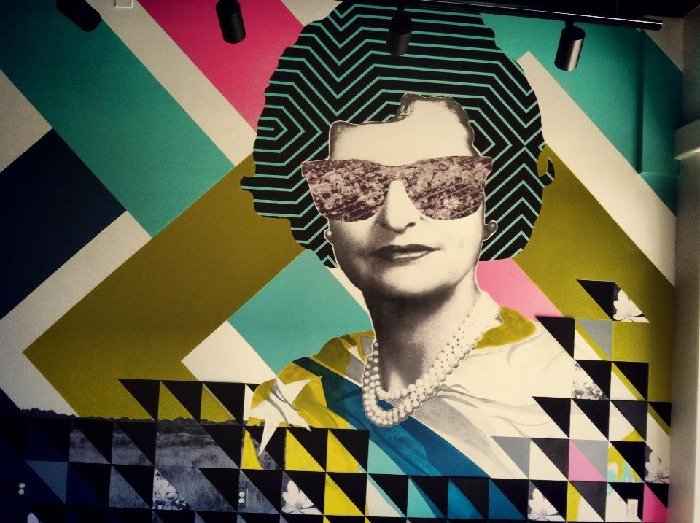 This large interior mural is latex paint and newsprint on sheetrock at Bird’s Barbershop in Austin, Texas.