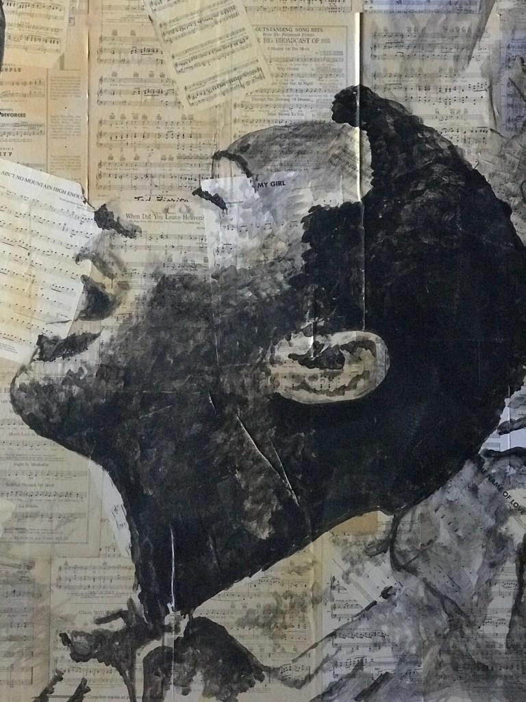 These portraits are painted on sheet-music. Each sheet was carefully placed and glued with various pages aged, coloured, and burned for texture.